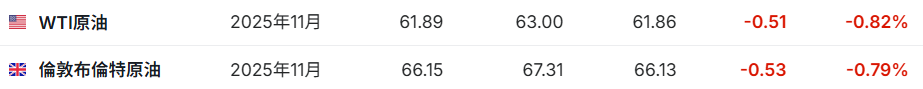 3. 截至发稿,WTI原油跌0.82%,报61.89美元/桶。布伦特原油跌0.79%,报66.15美元/桶。
