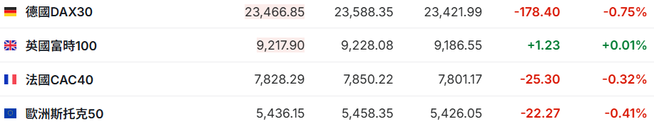 2. 截至发稿,德国DAX指数跌0.75%,英国富时100指数涨0.01%,法国CAC40指数跌0.32%,欧洲斯托克50指数跌0.41%。